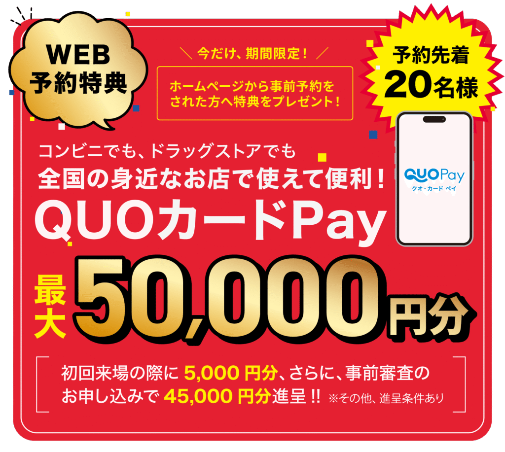 ※)QUOカードPayは初回のご来場時に5,000円分プレゼント、2回目のご来場で10,000円分、事前審査申込後、審査結果通知の際にご来場された時点で残りの35,000円分を進呈いたします。
